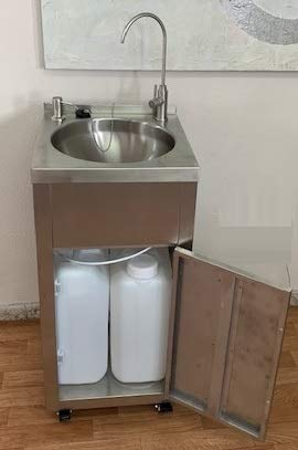 - Lavamanos Portátil y Autónomo conFunciona con un motor eléctrico, solo se tiene que abrir el grifo para la salida del agua. deposito de 40 litros. Fabricado en acero inox