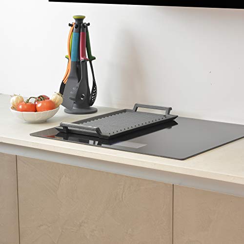 - ÚTIL: Esta placa de parrilla de hierro fundido se puede usar en ambos lados. Tiene una superficie acanalada y lisa. Con el lado acanalado, le darás a la carne una marca de primera clase. El lado liso es ideal para asar pescado o aves.