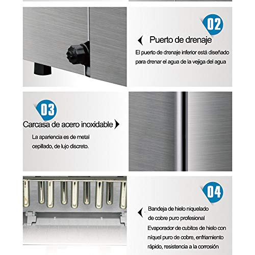- ■ Salida de hielo de alta eficiencia: la fábrica de hielo tiene una capacidad de tanque de agua de 2.2 litros con una capacidad de producción diaria de 15 kilogramos en 24 horas