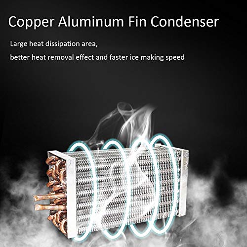 - El cobre y el condensador de aleta de aluminio, gran área de disipación de calor, un mejor efecto de eliminación de calor, el hielo más rápido haciendo velocidad. la producción de hielo rápida en 6-8 minutos, y la salida 9 PC cada vez