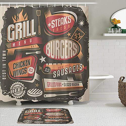 Juego de cortinas y tapetes de ducha de tela,Diseño de menú de parrilla de fiesta de barbacoa con filetes hamburguesas,cortinas de baño repelentes al agua con 12 ganchos, alfombras antideslizantes