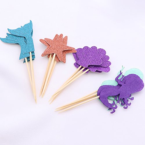 - 【Cantidad】Conjunto de 55 piezas de toppers de pastel de glitter marino con 11 estilos diferentes que son estrellas de mar con brillo dorado, algas marinas, caballito de mar, cola de sirena azul, cola de sirena roja y cola de sirena con brillo plateado, concha marina, estrella de mar, caballito de mar, algas marinas, cada una kind tiene 5 piezas, cantidad suficiente para que pueda usar o compartir con amigos.