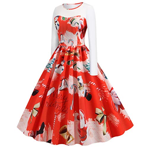 Auifor Vestido de Navidad de Vestir de Manga Larga de impresión de Navidad de la Mujer Vestido de Las señoras de la Vendimia(A-Rojo/Large)