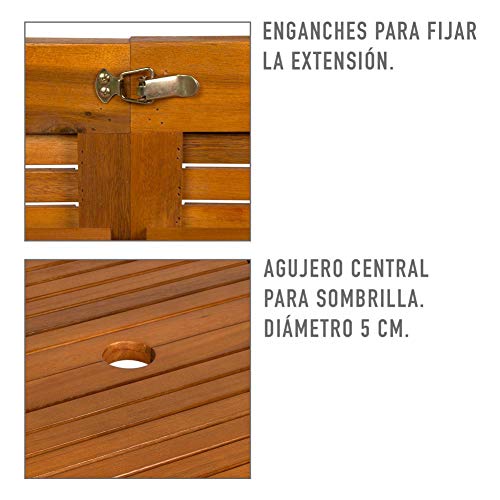 - Estructura sólida y duradera, la base tiene un diseño en lamas y cuenta con un orificio de 5 cm en el centro para instalar una sombrilla (no incluida)