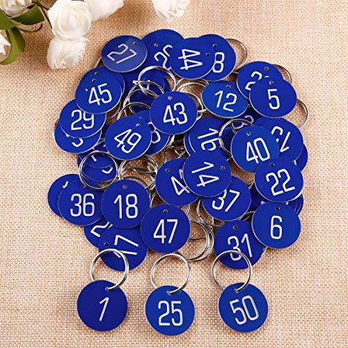 SurePromise - Lote de 50 discos de números grabados para mesas de boda, fiesta, taquilla, pub, restaurante, catering (azul, 1-50, con anillos)