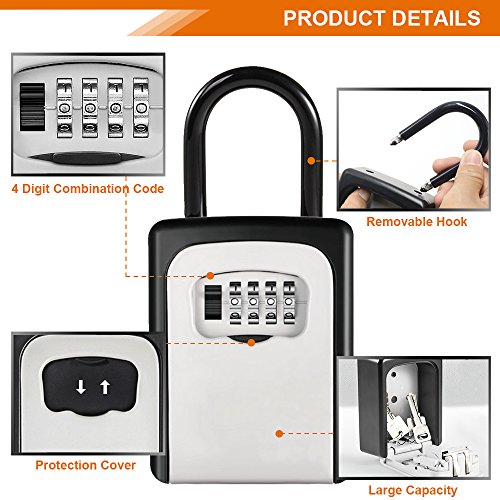 - 【Material duradero】 La caja fuerte de la llave está hecha de aleación de zinc de alta resistencia y acero sólido para resistir el aplastamiento, el aserrado y la turbulencia. Nuestras cajas fuertes con llave externa cuentan con una cubierta de goma extraíble que protege contra el polvo, el óxido, la luz solar, la lluvia y la nieve.