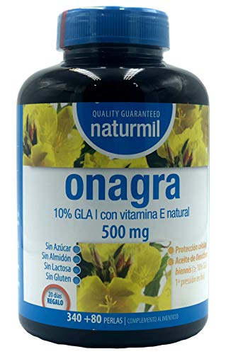 NATURMIL Aceite de Onagra 500 MG, 420 perlas, Con vitamina E, sin gluten, sin lactosa, sin azĂșcar, sin almidĂłn, libre OGM, 10% gla