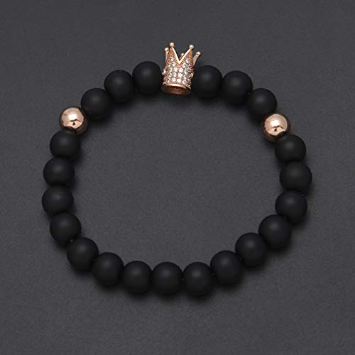 - 4. Esta pulsera de producto está hecha de ágata negra mate y microincrustaciones de cobre. Las dos cuentas de cobre y el diseño de la corona son diferentes en color, añadiendo un toque de ligereza a la pulsera negra mate.