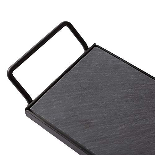 - [CONTIENE] - Bandeja de pizarra fijada en soporte de metal con asas. Se puede utilizar como portavasos y vajilla así como bandeja de quesos, sushi, postres, aperitivos o como decoración.