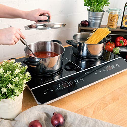 - 【Panel de alta calidad y fácil de operar】Domino construido en doble placa de inducción con panel de control táctil digital de superficie de cristal negro pulido, sensible al control, fácil de operar. La apariencia elegante es una opción óptima para las familias modernas y la decoración de la cocina.