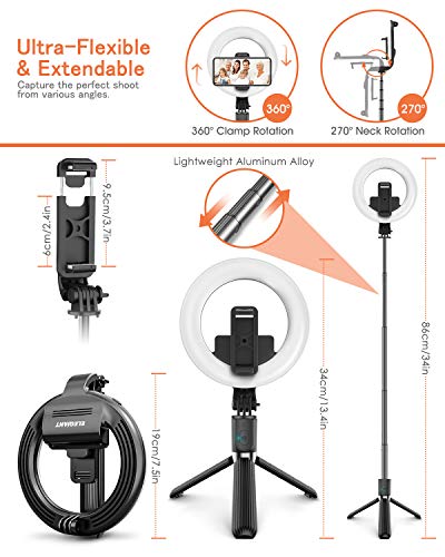 ELEGIANT Palo Selfie Trípode, Selfie Stick con Anillo de luz LED para Fotografía con Control Remoto Bluetooth para Cámara Deportiva, Móvil, Gopro, Sirve para Youtube Maquillaje, Aro de luz Ajustable