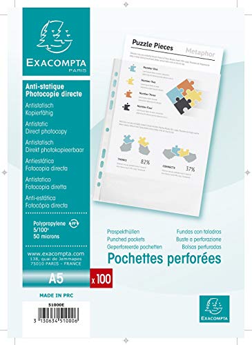 Exacompta 51000E - Bolsa de 100 fundas perforadas (polipropileno granulado 5/100e para archivar documentos A5, 14,8 x 21 cm), color transparente
