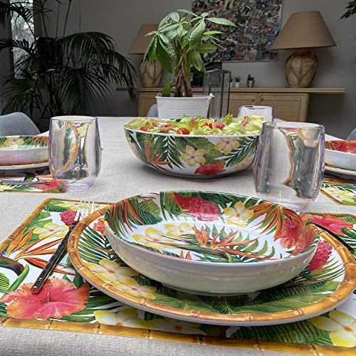 - Este plato sopero de melamina es ideal como raviero o como plato sopero, plato de pasta. Le encantará su atmósfera tropical con su diseño que mezcla diferentes flores exóticas que le darán calidez a su mesa.