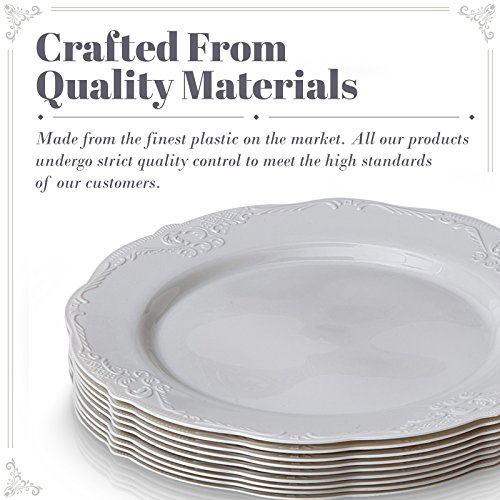 - FABRICACIÓN EXQUISITA: Estos atractivos platos desechables están diseñados con bordes redondos y delicados detalles. Los bordes anchos y el diseño clásico y elegante los convierten en el producto perfecto para cualquier combinación de color o motivo festivo.