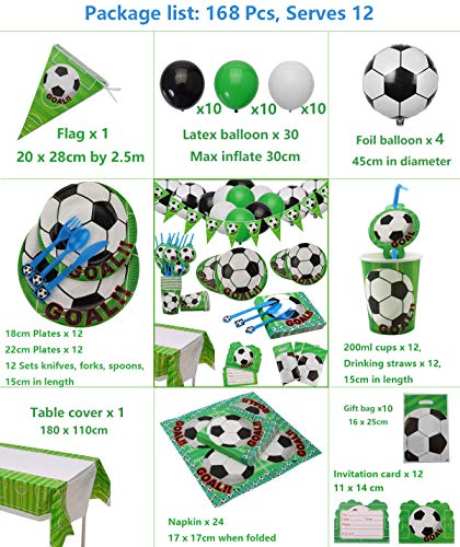 Suministros de Fiesta de FúTbol Para 12 Invitados, Incluye Platos, Tazas, Servilletas, Cucharas, Cuchillos, Tenedores, Tarjetas de Invitación, Mantel, Pancarta, Bolsas y Globos de Regalo, 168 Piezas