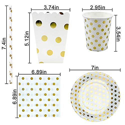 - Tamaño perfecto: el diámetro de los platos de papel de 7 pulgadas es respectivamente de 18 cm, la longitud lateral de las servilletas es de 17,5 cm, la longitud de la pajita es de 19,8 cm, el diámetro superior del vaso de papel es de 7,5 cm y la altura es 9 cm, el diámetro superior de las cajas de palomitas es de 9,5 cm y la altura es de 13 cm.