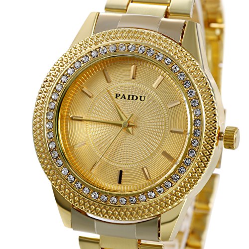 Avaner Reloj Dorado de Esfera Dorada Oro Dial con Diamantes de Imitación Brillantes, Grande Reloj de Caballero Cuarzo Japonés, Reloj de Hombre Acero Inoxidable Hip Hop Style
