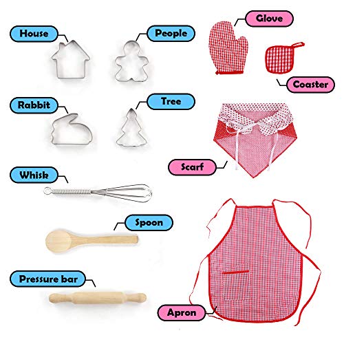 - 12 piezas juego de chef incluye: También se puede utilizar como halloween decoracion. un gorro de chef, un delantal, un guante especial para horno, dos cucharas de madera, una batidora manual, agarradera, un rodillo y 4 moldes para galletas. Apto para todas las necesidades de cocina y pastelería.