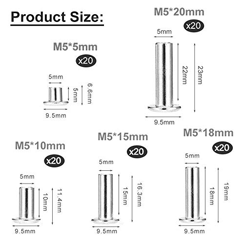 Keleily Kit de tornillos de unión de 100 piezas de metal con pernos de tornillo de cabeza cruzada redonda Remaches de uñas para encuadernación artesanal de cuero DIY - M5 X (5/10/15/18 / 20MM)