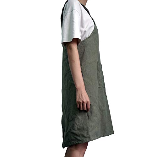 LeerKing Delantal de Cocina 100% algodón y Lino Delantal de Chef Hornear jardinería Restaurante Barbacoa con 1 Bolsillo Cuello Cruzado para Mujeres, Verde Oscuro