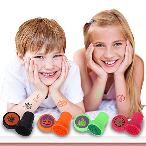 - El surtido de sellos de Halloween para niños incluye 50 piezas de sellos con 25 diseños diferentes (cada diseño tiene dos colores diferentes). Cada tamaño Aprox.:1.5 "*1". Tetas engomadas del tatuaje de Halloween tamaño: 10.5 * 6 cm.