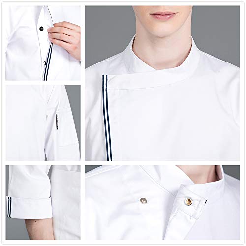 - Bolsillo práctico: bolsillo para termómetro en el brazo izquierdo, bolsillo para bolígrafo y diseño de botón a presión invisible, material duradero, abrigo de chef ejecutivo cómodo y profesional con botones en el cuello.