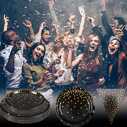 - Fiesta Temática Negro & Dorado - Nuestro paquete de platos fiesta presenta elegantes puntos de papel de dorados esparcidos sobre un fondo negro. Agregando un toque elegante y moderno a cualquier fiesta. Como 18 50 70 cumpleaños, fiesta de graduacion, cóctel fiesta, años 20, despedida de soltero, Halloween, aniversarios, etc.