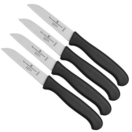 - Exclusivo: los cuchillos de cocina de Schespkrone se fabrican en Solingen y cumplen con los más altos estándares de calidad. Juego de 4 cuchillos para pelar o verdura rectos y curvados con mango de plástico higiénico.