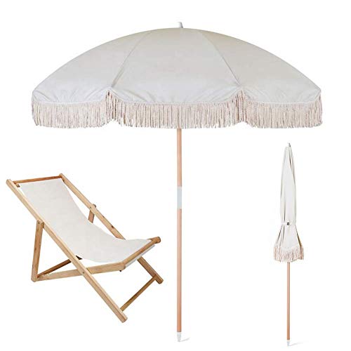 JFFFFWI Parasol de jardín Sombrilla de Playa con Flecos Protección Solar 100% UV Portátil y fácil de Instalar en la Arena y Seguro en el Viento