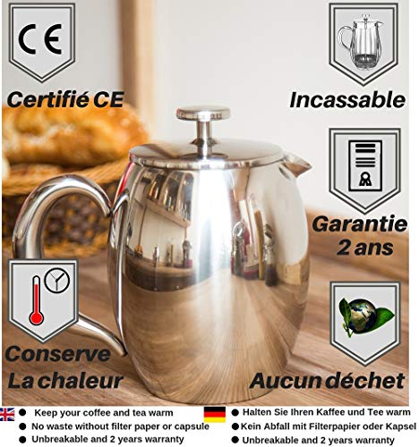 - ✔ Café caliente más tiempo - Cafetera francesa con doble pared térmica de acero inoxidable cuidadosamente pulido que le permititrá disfrutar del café caliente durante más tiempo para un desayuno prolongado