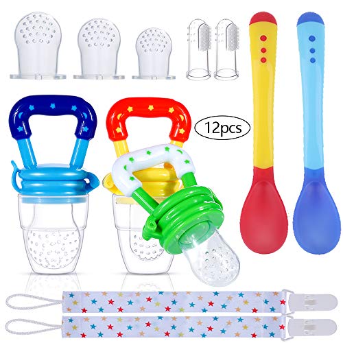 Conjunto de 12 piezas: 3 * Alimentador de frutas para niños / 3 estuche de silicona de repuesto para talla S, M, L / 2 * clip de chupete / 2 * Cucharas de alimentación para bebés / 2 * Cepillo para dedo del bebé.