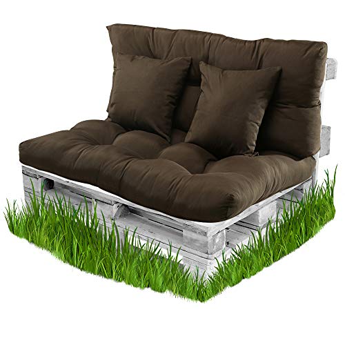 - [SET COMPLETO]: Este set incluye 1 cojín de asiento 70x110x15cm + 1 cojín de respaldo 40x110x15cm + 2 almohadas 40x40x15cm. Por tener relleno de fibra y ser fabricado manualmente, el cojín puede tener una pequeña variación en las dimensiones. No incluye palet. Modelo: Color Marron