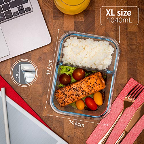 - ✅RECIPIENTE COMIDA TAMAÑO XL: Come hasta saciarte con grandes cantidades gracias a los meal prep cristal hermeticos con una capacidad de 1040ml especialmente diseñados para hombres, mujeres, niños y adolescentes en pleno crecimiento ¡El volumen de los botes de cristal con tapa es suficientemente grande para tener una comida completa y equilibrada!
