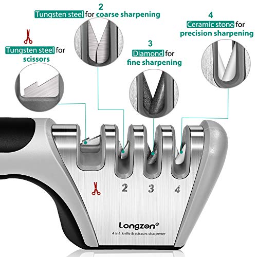 - [Afilador de cuchillos profesional 4 en 1] La función de afilador cuchillos incluye el rectificado en bruto, el rectificado fino y el pulido. Puede afilar cada cuchillo sin filo dependiendo del grado de desgaste.También diseñamos especialmente una ranura para cuchilla de afilar para tijeras.