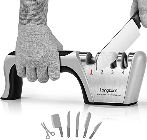 longzon Afilador de Cuchillos,Afilador de Cuchillos Manual, 4 en 1 Afilador Cuchillos Profesional con Guantes Antideslizantes para Cocina, para Cuchillos y Tijeras