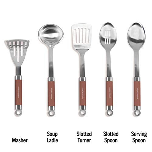 - 8 piezas que incluyen: 1 cucharón, 1 espumadera, 1 tornero ranurado, 1 servidor de pasta, 1 cuchara para servir, 1 trituradora de papas, 1 batidor de huevos, 1 soporte
