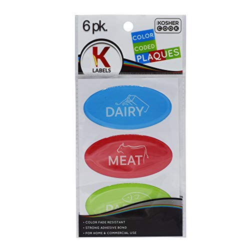 Kosher Cook - Juego de 6 placas y etiquetas, 2 azules, 2 de carne, 2 verdes, autoadhesivas, color resistente a la decoloración, pegatinas de cocina con código de color