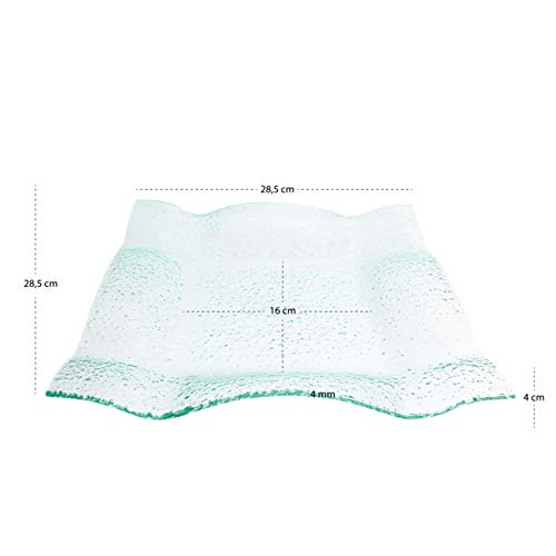 - ESTILO: Su tamaño es perfecto para uso individual o como plato al centro de la mesa. La forma y textura especial del mejor cristal, transparente y de brillo intenso destacará cualquier emplatado: entrante, plato principal o postre. Es un plato práctico, versátil, creativo y elegante. Medida: 28,5x28,5x4 cm.