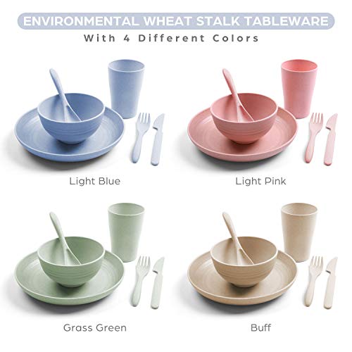 Odoland Cubiertos y Platos Kit de Trigo Ecológico para Acampar 24 Piezas con Platos Cuencos Tazas Tenedores Cucharas Cuchillos y Bolsa Portátil, Kit de Picnic para 4 Personas, Vajilla de Camping