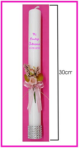 FIESTADEKOR Vela/Cirio para Bautizo de Cera Blanca Decorada con Pick Floral, Cinta y Lazo de Organza y remate de brillantitos Plateados en su Base. Medida 3x30cm. (Rosa Personalizada)