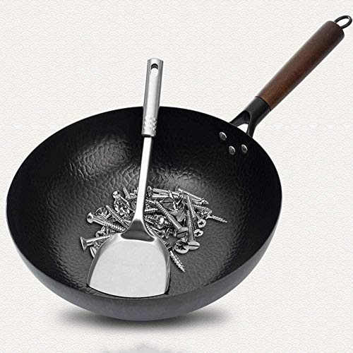 - ● Wok de hierro puro hecho a mano: la impresión del tiempo de wok manual tradicional a la antigua, sin recubrimiento químico, olla de forja tradicional a la antigua, sin miedo a que la pala dure más