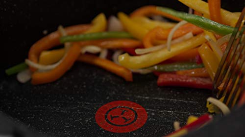 - Thermospot: El punto central ayuda al control de la temperatura, cambia de color cuando la sartén alcanza 180ºC, optimo para cocinar la mayoría de platos